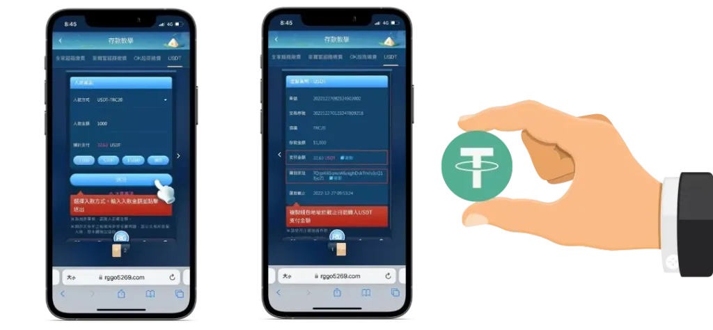 - 揀選 USDT 存款方式,輸入【金額】後撳送出
