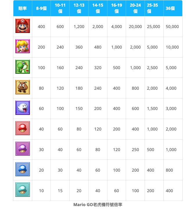 了解符號的賠付率能幫助你更好地預估收益。在 Mario GO 中,收集越多相同的符號,賠率越高(最高可達 36 個符號同框)。以下為部分高賠率符號的彩金參考(以下注為 40 時計算):